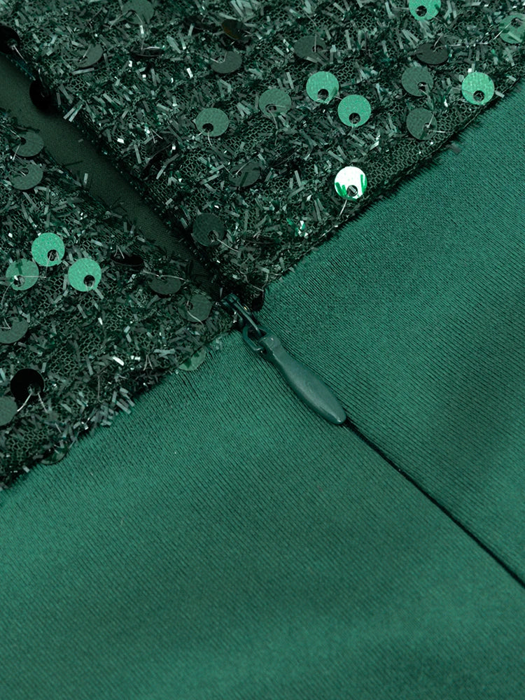 This strapless maxi dress combines elegance and allure with its sequined patchwork design in green and black. Featuring a pleated skirt and a sleeveless, backless silhouette, it drapes smoothly to flatter the figure. Ideal for evening parties, its slim fit enhances your shape while the shimmering sequins ensure you stand out with sophisticated glamour.